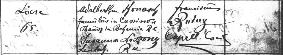 Residence: Levoča, house #65. Godparents: Vojtech Kovač, servant in Košice, originally from Taus in Bohemia, a Roman Catholic and Suzana Lisoňová from Levoča, a Roman Catholic. Officiant: František Rolny.