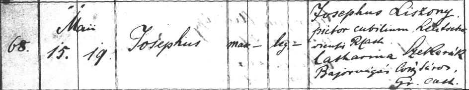 Entry #68 for the year 1885 from the baptismal register of St. James’ Cathedral in Levoča: Born May 15 and baptized May 19, 1885, Joseph, legitimate son of Jozef Lisoň, room painter from Levoča, a Roman Catholic and Katarína Sekeráková from Bajerovce in Šariš, a Greek Catholic. |