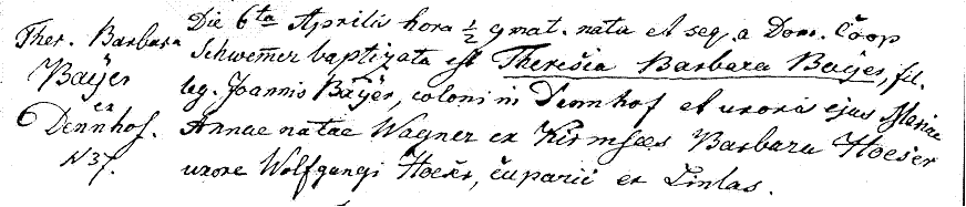 Dennhof is the birthplace of Theresia Barbara Bayer, wife of Johann Schmid from Tressau. She was born on April 6, 1833 in house #37 as described in her baptismal entry from the Roman Catholic parish register of Kirchenpingarten (pictured below). In 1991 when this photograph was taken, the exact dwelling in which she was born was not able to be determined due to changes to buildings within the village since Theresia’s departure for America in 1860. |