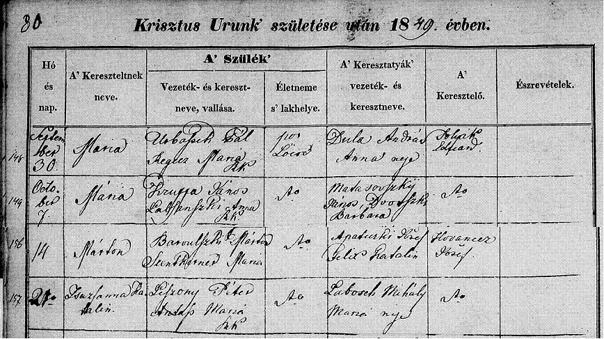 The story that this family presents is interesting in both the facts that have been documented and the information that has eluded research. From the baptismal record of the cathedral of St. James in Levoča pictured below, we know that Zuzanna Katarína was baptized on October 21, 1849, her entry being number 157 for the year. |